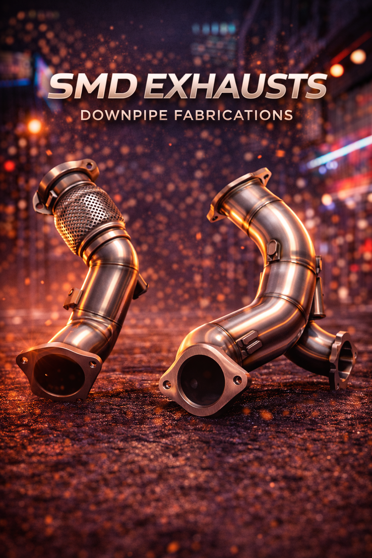 SMD Downpipes/Exhausts fabricated in-house. CNC machined exhaust flanges, SS 304 63mm & 76mm options available. Tig welding done.